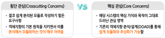 횡단관심코드 : 데이터 처리 명령을 제외한 보조적인 기능을 제공하는 명령(로그 처리, 보안 처리, 트랜잭션, 예외 처리 등)