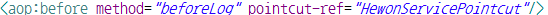 pointcut-ref 속성(before 엘리먼트 속성) : pointcut 엘리먼트의 식별자(id 속성값)를 속성값으로 설정