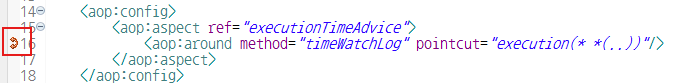 - pointcut 속성 : 핵심관심모듈로 등록된 Spring Bean의 메소드 중 횡단관심코드가 삽입될 타겟메소드를 지정하기 위한 Pointcut 표현식을 속성값으로 설정(타겟메소드 지정)