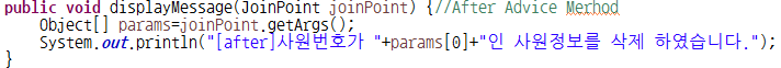 - JoinPoint 외에 매개변수를 하나 더 쓸 수 있다. Object type으로 매개변수를 지정하면 타겟메소드의 반환값이 어느 type이든 저장 가능.(반환값의 type을 알 경우는 type 지정하면 됨)