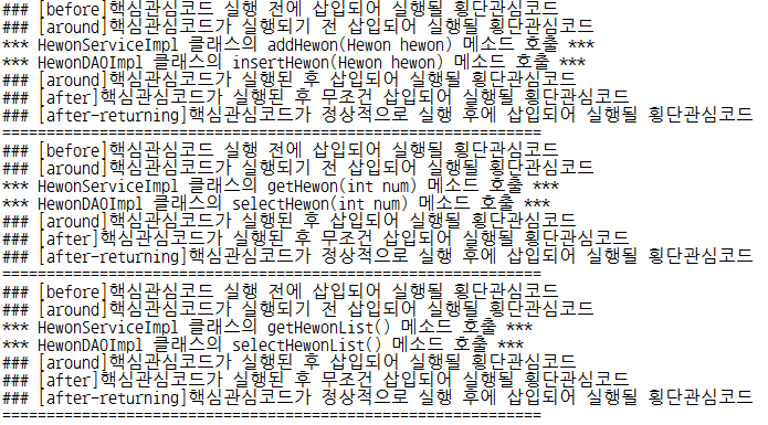 HewonApp 출력 콘솔⬇️(* after-throwing은 예외가 발생하지 않아서 출력되지 않음)