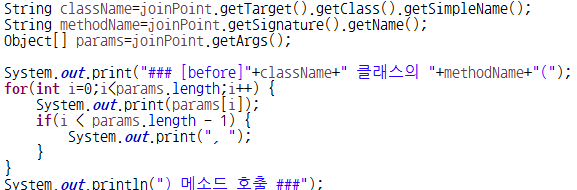 AspectJ 컴파일러에 의해 Advice 클래스의 메소드가 호출될 때 타겟메소드 관련 정보가 저장된 JoinPoint 객체를 전달받아 매개변수에 저장