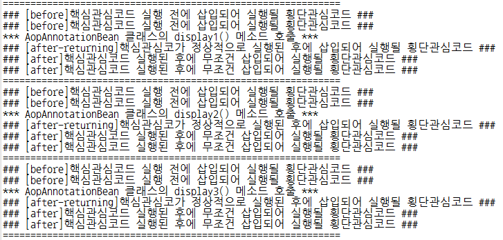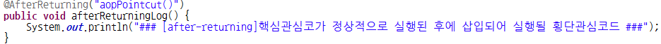 after-returning : 타켓메소드의 명령(핵심관심코드)이 예외 없이 정상적으로 실행된 후에 횡단관심코드를 삽입해 실행되도록 설정하기 위한 엘리먼트