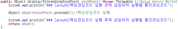 @Around : 타겟메소드의 명령(핵심관심코드)이 실행 전과 후에 삽입되어 실행될 횡단관심코드를 제공하기 위한 어노테이션