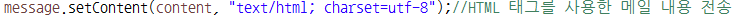 - MimeMessage.setContent(Object o, String type) : MimeMessage 객체의 메일 내용을 변경하는 메소드