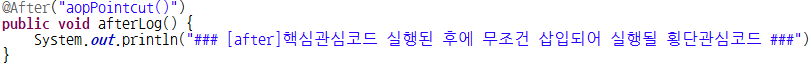 @After : 타겟메소드의 명령(핵심관심코드)이 실행된 후에 삽입되어 실행될 횡단관심코드를 제공하기 위한 어노테이션