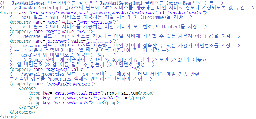 ➡️설명 : JavaMailSender 객체를 저장하기 위한 필드를 작성하고 Configuration File에서 Dependency Injection하여 SMTP 서비스를 제공하는 정보를 저장