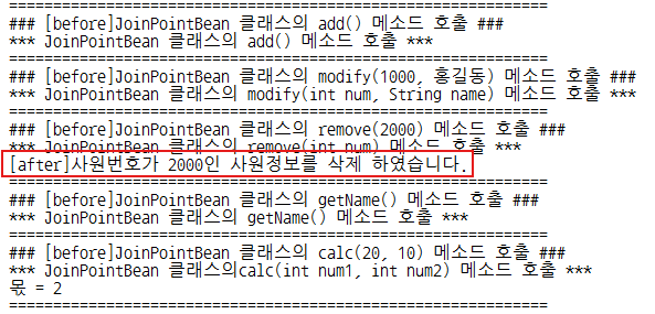 after : 타겟메소드의 명령(핵심관심코드)이 실행된 후 무조건 횡단관심코드를 삽입해 실행되도록 설정하기 위한 엘리먼트