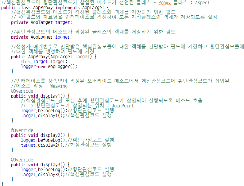 9. AopProxy : 핵심관심코드에 횡단관심코드가 삽입된 메소드가 선언된 클래스 - Proxy 클래스 : Aspect(핵 & 횡 결합되어 만들어진 것)