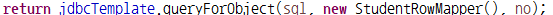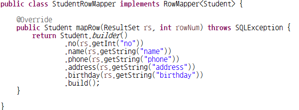 → RowMapper<T> 인터페이스를 상속받은 StudentRowMapper 클래스를 불러와 작성(익명의 내부 클래스 작성 - 유지보수 효율성 증가)⬇️