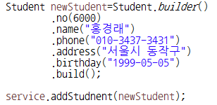 3. Student : STUDENT DTO 클래스 - 테이블의 하나의 행을 작성해 표현(@Data, @Builder 어노테이션 사용)