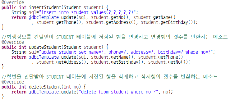 5. StudentDAOImpl DAO 클래스(StudentDAO 인터페이스 상속) : Spring DAO 기능을 사용해 DAO 클래스 작성→ Template Method Pattern이 적용된 JdbcTemplate 객체의 메소드를 호출하여 DAO 클래스의 메소드 작성