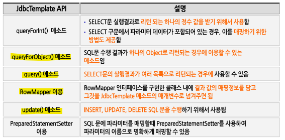 - JdbcTemplate.update(String sql, Object ... args) : SQL 명령(INSERT, UPDATE, DELETE)을 DBMS 서버에 전달하여 실행하는 메소드, 인파라메타에 저장될 값