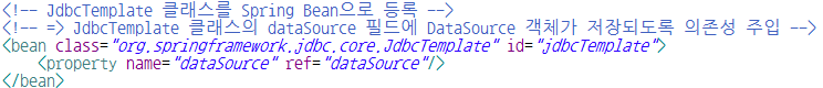 → JdbcTemplate 클래스의 dataSource 필드에 DataSource 객체가 저장되도록 의존성 주입
