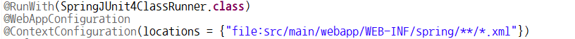 @WebAppConfiguration : SpringJUnit4ClassRunner 클래스에서 생성되는 스프링 컨테이너를 ApplicationContext 객체가 아닌
