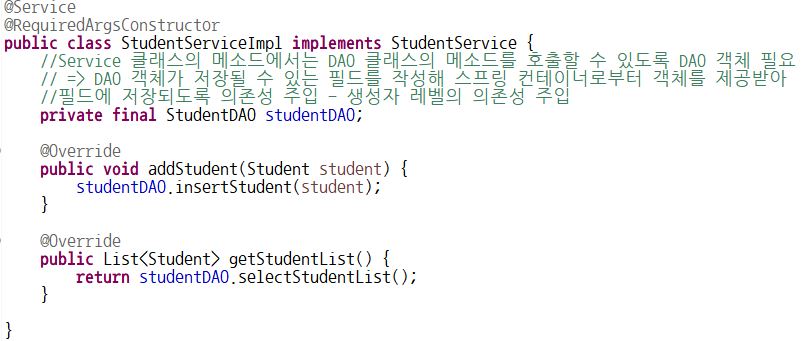 - 필드에 SqlSession 객체를 제공하는 SqlSessionFactory 객체가 저장되도록 의존성 주입 - Constructor Injection