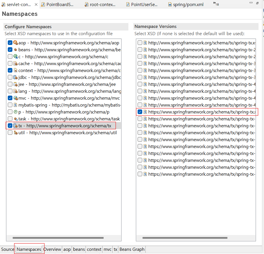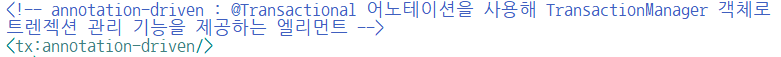 ① TransactionManager 객체를 사용해 트랜잭션을 관리할 수 있도록 설정하기 위해 tx 네임스페이스에 spring-tx.xsd 파일을 제공받아 엘리먼트를 사용할 수 있도록 설정