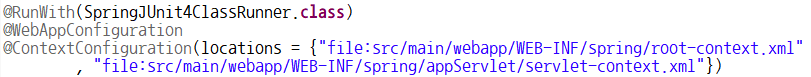 @ContextConfiguration : 스프링 컨테이너에게 Spring Bean Configuration File을 제공하는 어노테이션
