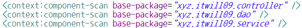 - servlet-context.xml : DAO, Service, Controller 클래스의 Spring Bean 존재