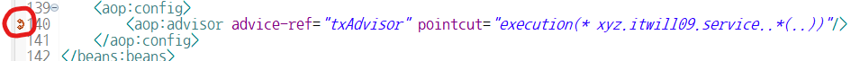 ➡️설명 : pointcut 속성에 설정된 패키지 내의 모든 메소드에 트랜잭션을 자동으로 처리해 줌(해당 메소드 왼쪽에도 위와같이 굽은 양쪽 화살표 표시가 되어 있다.)
