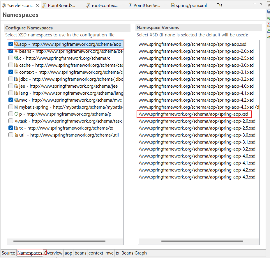 ② Spring AOP 기능을 사용하기 위해 aop 네임스페이스에 spring-aop.xsd 파일을 제공받아 엘리먼트를 사용할 수 있도록 설정