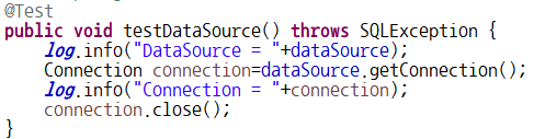 2. DataSourceTest.java : 데이터베이스에 연결이 정상적으로 이루어졌는지 올바른 쿼리가 실행되는지, 트랜젝션 관리가 제대로 이루어지는지 등의 역할