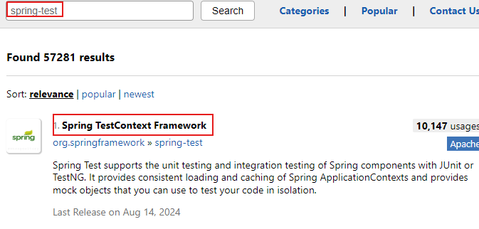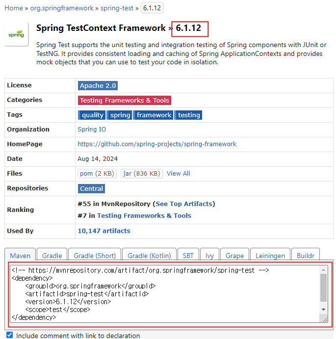 3. [src/test/java] 패키지 폴더에 테스트 클래스(테스트 프로그램) 작성 → junit 라이브러리와 spring-test 라이브러리의 scope 속성을 주석 처리한 후 클래스 작성(for 자동완성)
