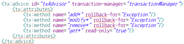 - method 엘리먼트 : TransactionManager 객체에 관리될 메소드의 이름과 트랜잭션 처리 방식을 설정