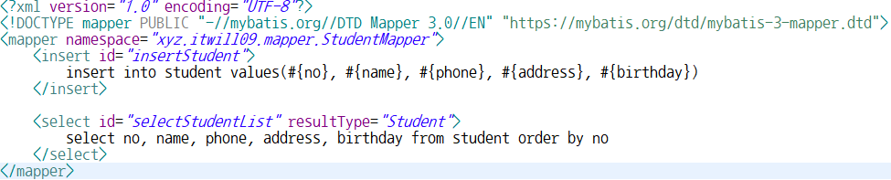 - ➡️설명 : StudentMapper 인터페이스와 매핑시켜주고 각각의 SQL 쿼리를 자바 메서드와 연결해주는 역할을 하고 있다.