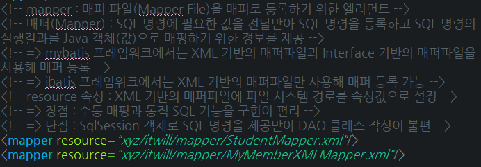 - List 객체의 요소에는 XML 기반의 매퍼 파일의 경로를 요소값으로 저장 - 매퍼 등록