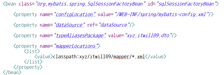 - configLocation 필드에 Mybatis 프레임워크의 환경설정파일(mybatis-context.xml)의 경로가 저장되도록 값 주입