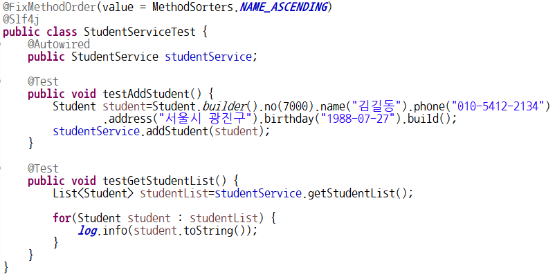- MethodSorters.NAME_ASCENDING) : 테스트 메소드가 이름순으로 실행