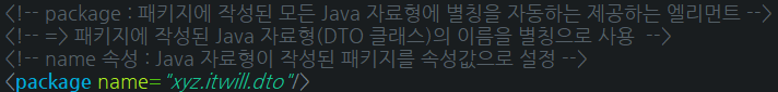 - Mybatis 프레임워크의 환경설정파일에서 typeAlias 엘리먼트의 package 엘리먼트와 유사한 기능 제공⬇️