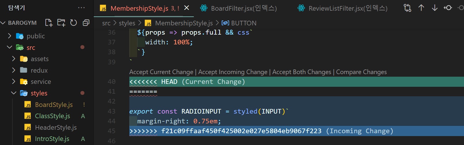 이렇게 직접 수정(이 과정이 merge겠지?)하고 변경사항을 다 스테이징 후 커밋하고, npm run start를 해서 구동해 보니 잘 된다.
