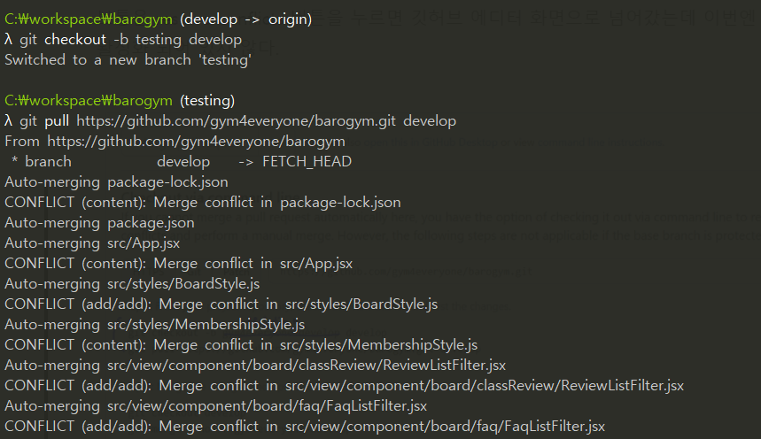 testing이라는 파생 브랜치를 만들고 그 브랜치로 checkout까지는 잘 됐는데, auto-merge를 시도했을 때 충돌(conflict)이 난 파일이 몇 개 있어서 코드를 직접 수정해 주기 위해 code . 명령어로 vscode에 들어갔다.