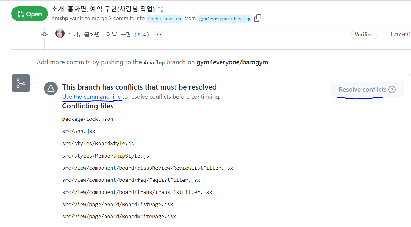 보통은 resolve conflicts 버튼을 누르면 깃허브 에디터 화면으로 넘어갔는데 이번엔 저 버튼이 활성화 되어 있지 않다.
