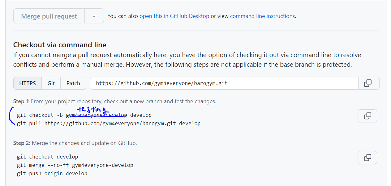 변경사항을 병합했으니 이제 깃허브에서 안내하는 Step 2대로(두 번째 사진 참고) develop 브랜치로 이동한 다음 testing 브랜치를 develop에 merge했다! 😀