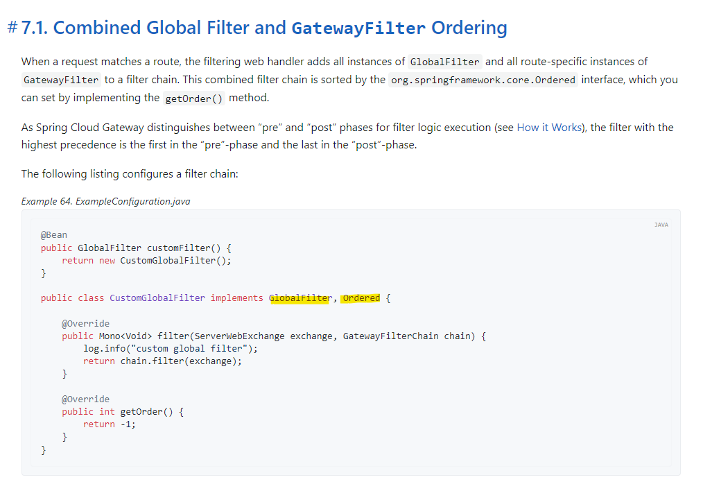 공식문서를 참조하면, 내부 동작에 따라 요청 경로가 Gateway Handler Mapping에 의해서 하나의 route에 매칭되면 Filtering Web Handler는 모든 GlobalFilter 인스턴스와 route에 등록된 모든 GatewayFilter 인스턴스를 Filter Chain 내에 추가합니다.