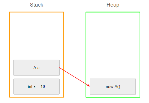 참조타입(A)은 Heap 영역에 생성된 객체(new A())의 참조값(주소)을 저장합니다.
