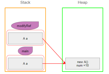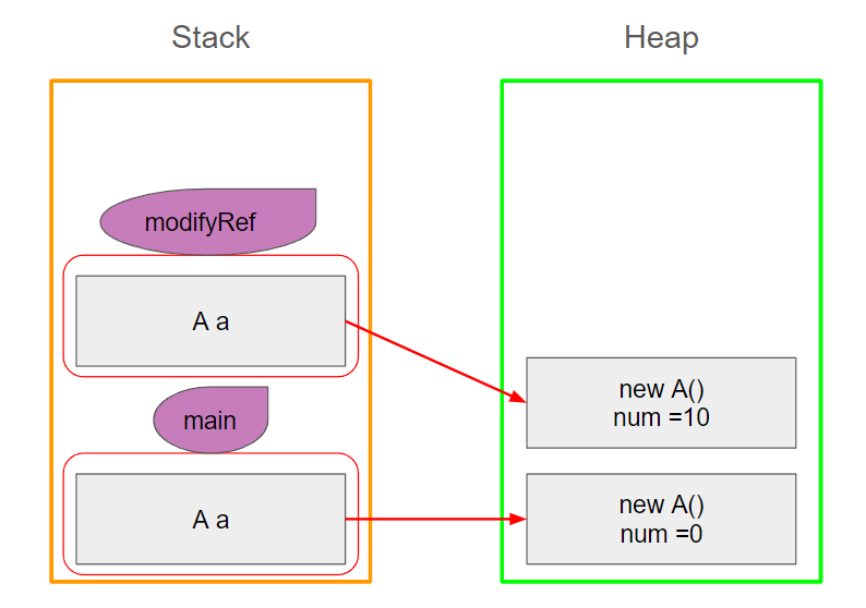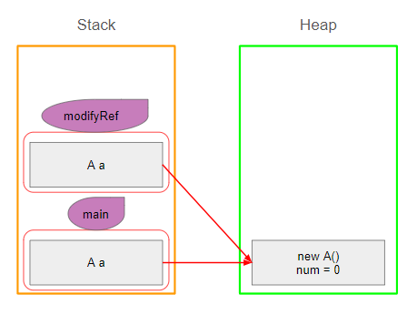 따라서, modifyRef 메서드에서 a라는 객체의 값을 변경해주면, 실제 메모리 안에 값이 변경되게 됩니다.
