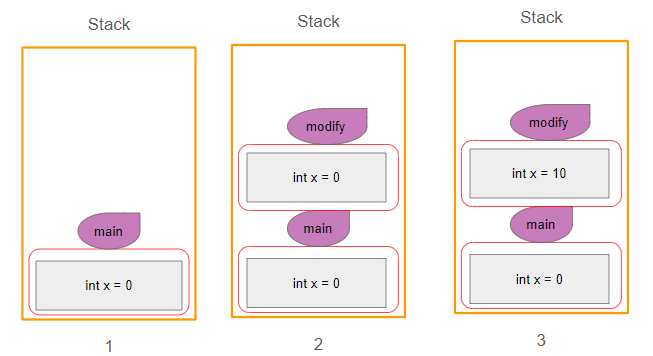 main 메서드 내 x라는 변수와 modify 메서드 내 x라는 변수는 다른 변수입니다.