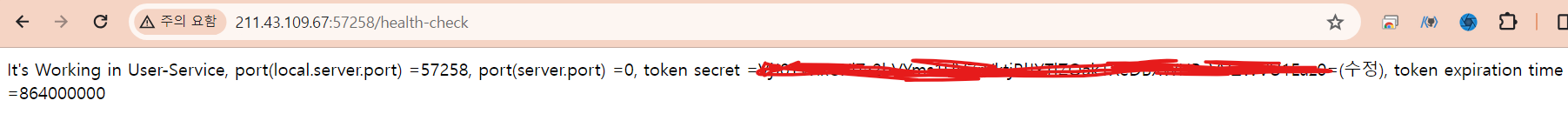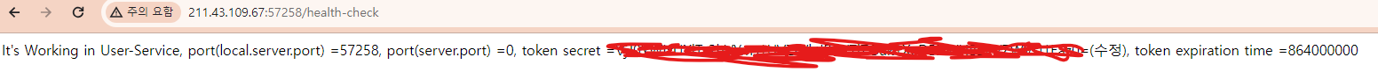 그 다음 User Microservice에 health-check 를 통해 설정 정보를 확인했지만 변화가 없었습니다.