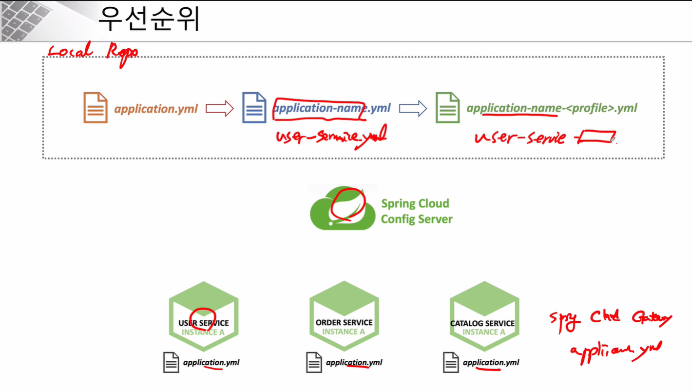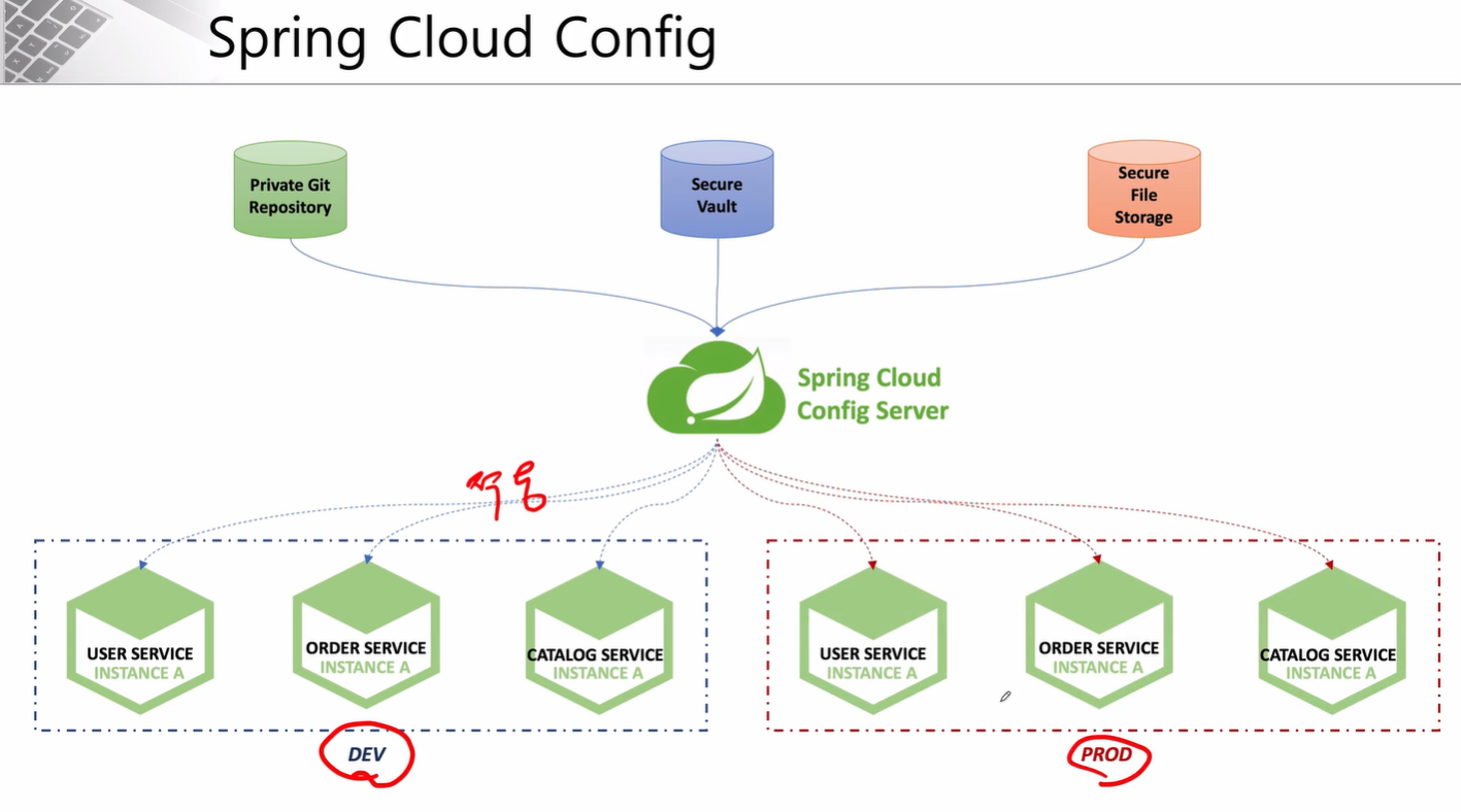 private Git Repository에 설정 정보를(application.yml) 저장한 뒤 Spring Cloud Config Server를 통해서 각 마이크로 서비스로 설정 정보를 동적으로 전달해줍니다.