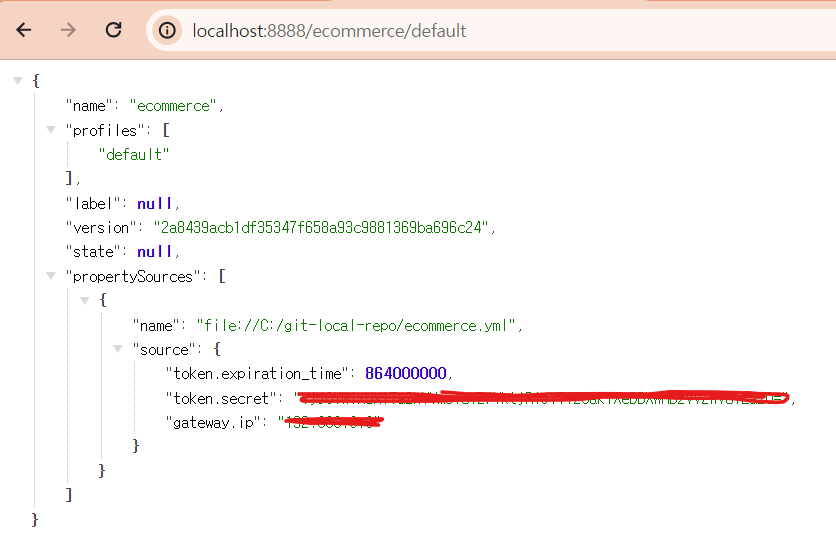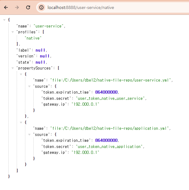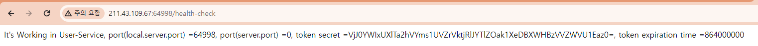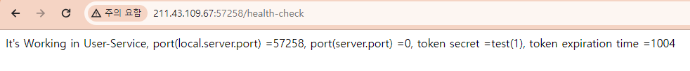 웹 브라우저 상에서 health-check 경로 요청 시 다음과 같이 Config Service에 저장된 정보들이 출력되는 것을 확인할 수 있습니다.