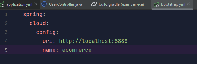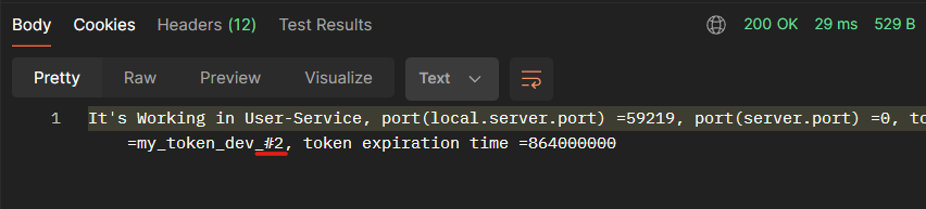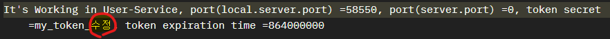 위처럼 설정 정보를 수정한 경우, 이를 반영하기 위해 git commit을 해준 뒤 User Microservice를 재기동 해줘야 반영이 됩니다.