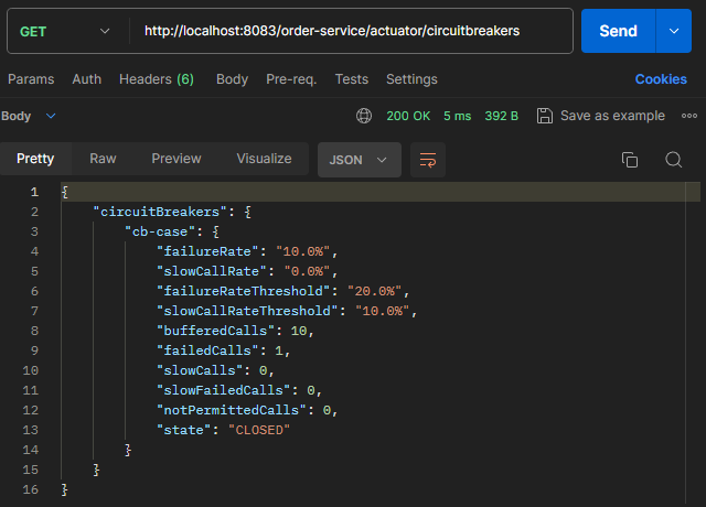 1회 실패가 발생했지만, 임계치가 20%이므로, Circuit이 CLOSED 상태입니다.