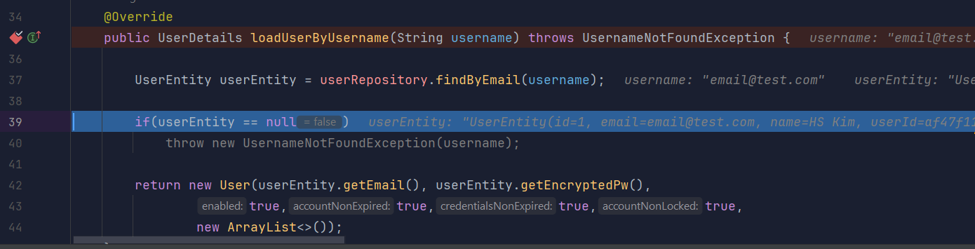 위처럼 UserServiceImpl에서 구현하여 회원정보를 Dto로 변환하여 AuthenticationFilter로 전달하도록 구현습니다.
