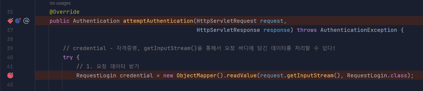 위에서 언급한대로 인증 요청 시 처음 실행되는 클래스는 AuthenticationFilter 클래스입니다.
