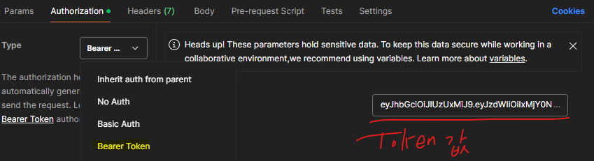 다음으로 정상적으로 리소스를 가져오기 위해서 로그인 시 발급 받았던 Token 값을 Authorization Header에 Baerer 토큰 타입으로 넣어보겠습니다.