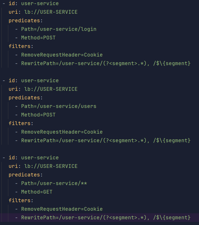 - RewritePath=/user-service/(?<segment>.*), /$\{segment}